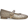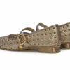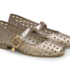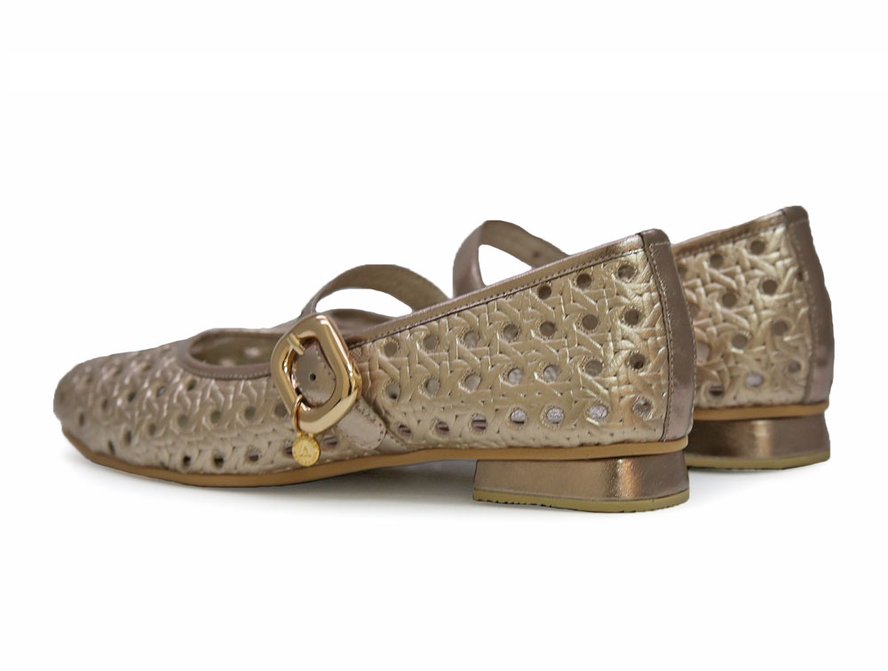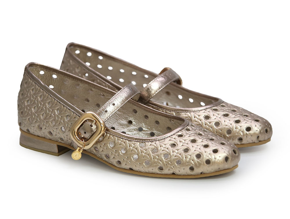 Baleta en cuero dorado con corte lazer. Un diseño artesanal que aporta frescura y elegancia. Su puntera redondeada y su correa añade un toque sofisticado.