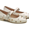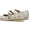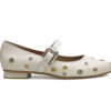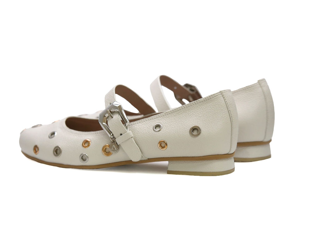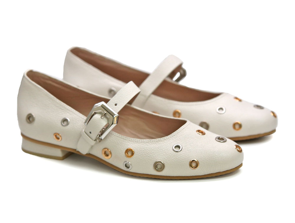 Baleta en cuero, con correa y hebilla ajustable. El detalle de ojales metálicos en tonos dorado y plateado le da un estilo contemporáneo y llamativo. Forro interno para mayor confort con suela plana antideslizante. Elaborados por manos Colombianas. |
