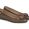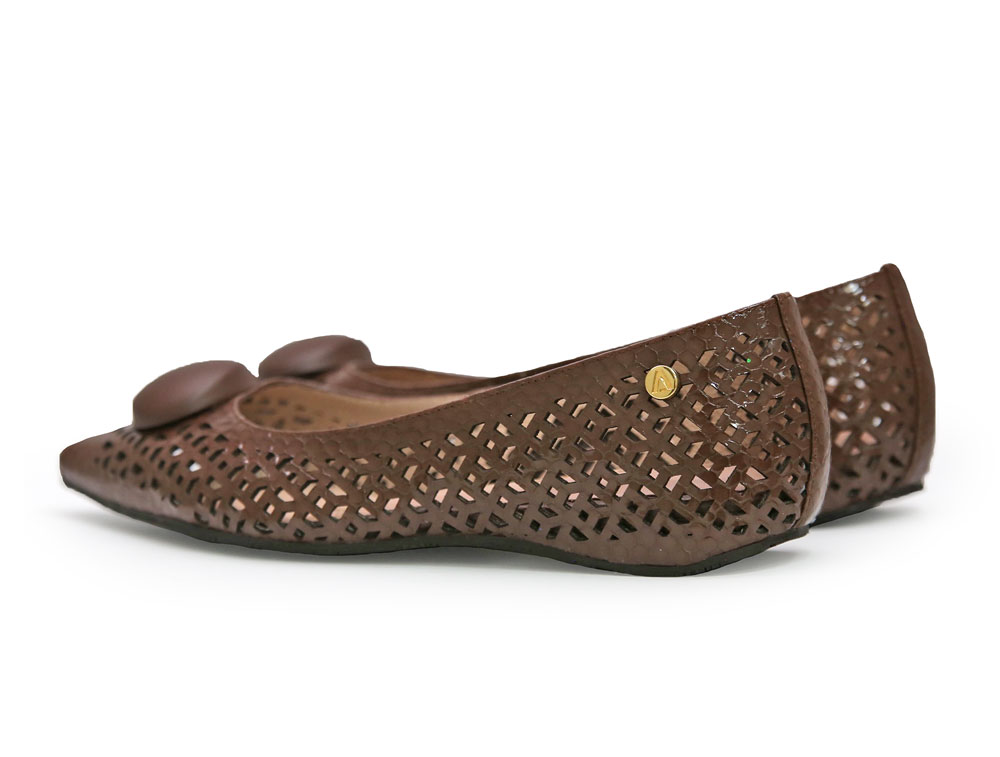 Baleta cafe, con troquelado geométrico que permite ventilación y un toque distintivo. Posee punta fina y un adornado decorativo del mismo color. Estas baletas con tacón interno son una excelente opción para quienes buscan la comodidad. Elaborados por manos Colombianas. |