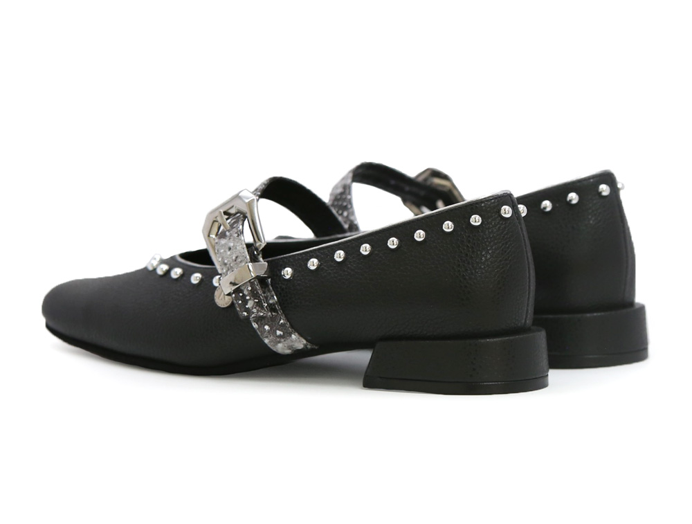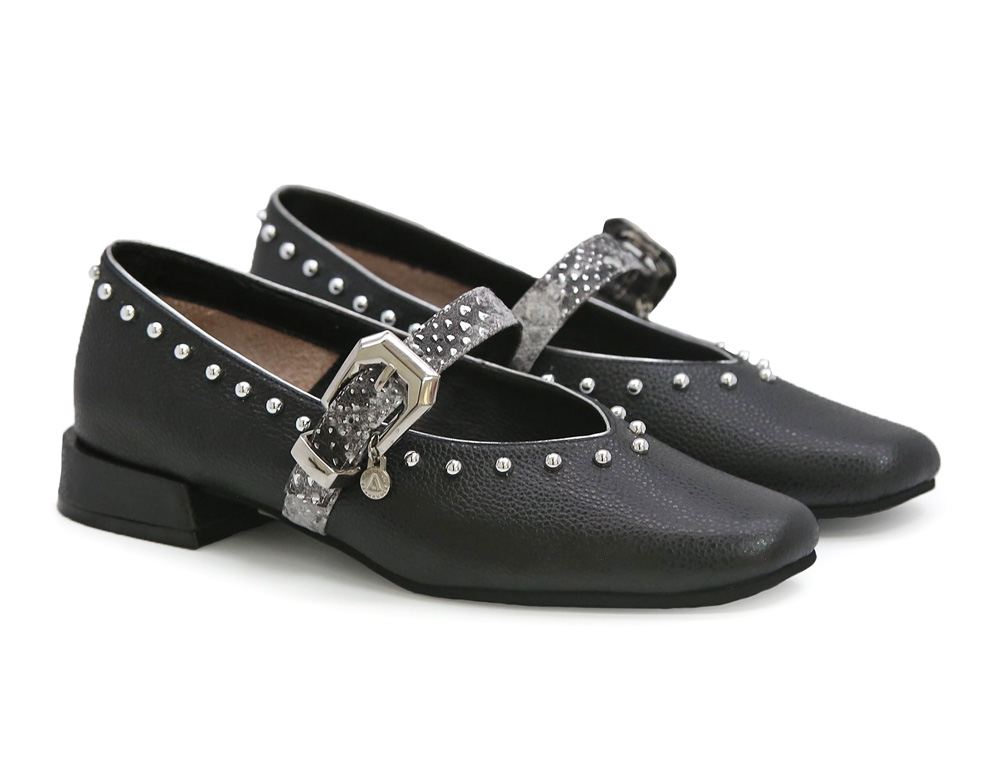 Baleta en cuero negro diseñada para quienes buscan comodidad y estilo. Su tacon bajo garantiza estabilidad y confort, mientras que los taches metálicos aportan un toque distintivo y glamuroso. Elaborados por manos Colombianas. |