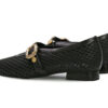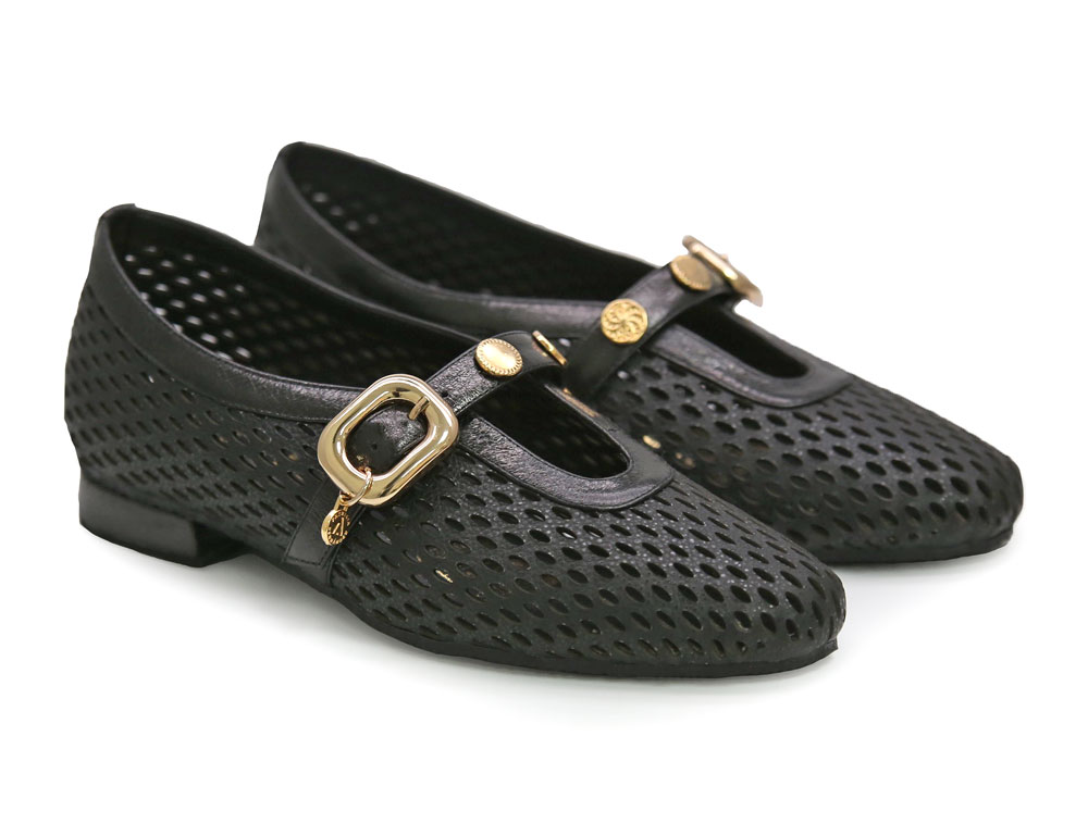 Baleta troquelada en cuero negro. Su diseño permite la ventilación y mantiene tus pies frescos. Posee Correa ajustable con hebilla cromada, junto con sus detalles dorados dan un toque elegante y sofisticado Elaborados por manos Colombianas. |
