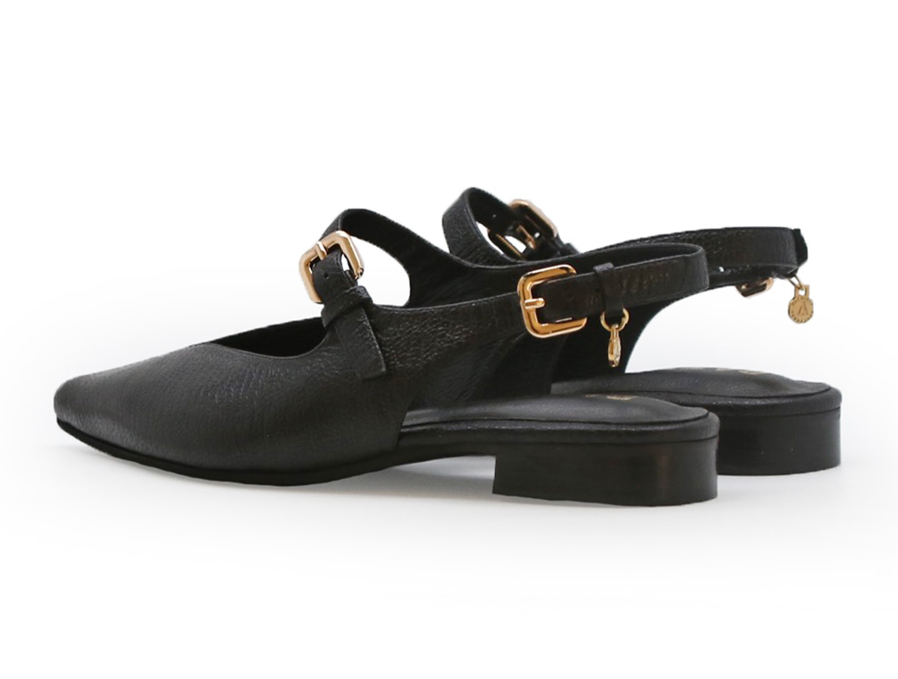 Baleta en cuero destalonada. Su diseño en punta estiliza el pie, mientras que la correa ajustable con hebilla cromada añade un toque sofisticado.