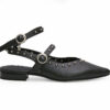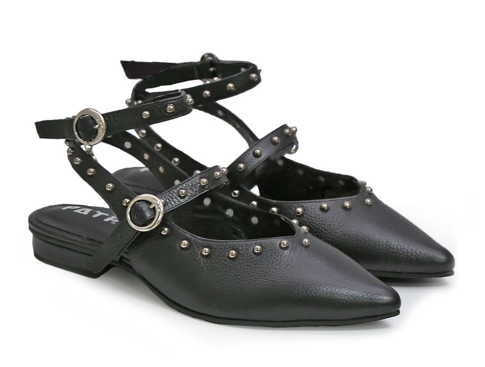 Baleta con diseño moderno y elegante en cuero negro. Cuentan con correas cruzadas al empeine ajustables que brindan seguridad, y taches metálicos decorativos que aportan un toque urbano y sofisticado. La plantilla acolchada garantiza comodidad durante todo el día, y la suela plana en caucho proporciona estabilidad y durabilidad. Perfectos para combinar con atuendos casuales o semiformales.