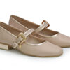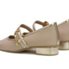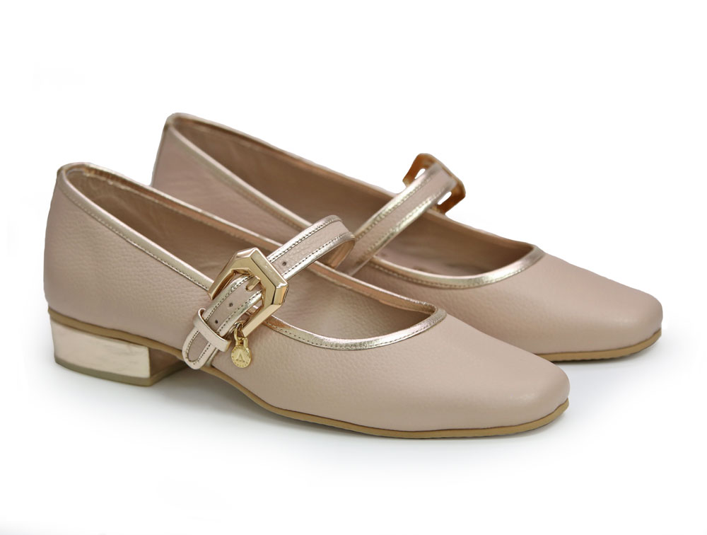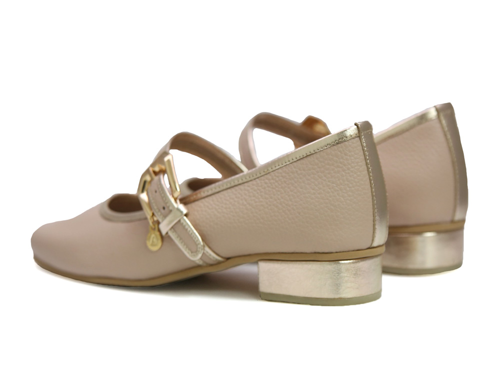 Baleta en cuero nude, con correa y hebilla ajustable. Incorpora detalles metalizados dorados en el borde Y tacon que añade un toque sofisticado. Perfectos para el uso diario o para eventos especiales Elaborados por manos Colombianas. |