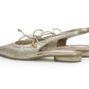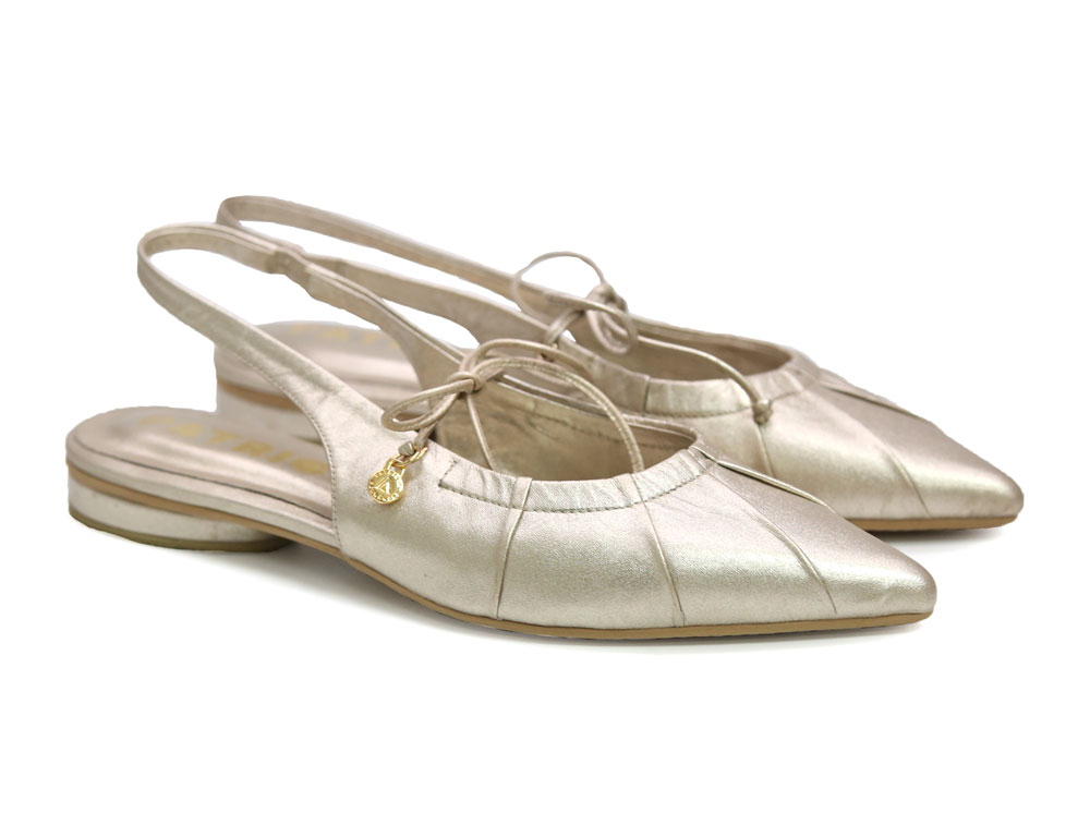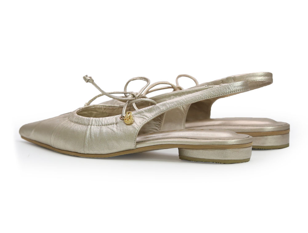 Baleta dorada, elaborada en cuero que aporta confort y resistencia. Su diseño de punta fina estiliza el pie, mientras la correa elástica trasera brinda un ajuste cómodo y práctico. Incorpora delicadas costuras frontales que realzan su estilo femenino y sofisticado. Ideal para el día a día o para complementar looks más formales, combinando comodidad, y versatilidad. Elaborados por manos Colombianas. |