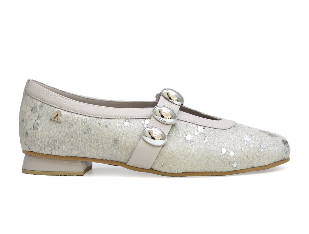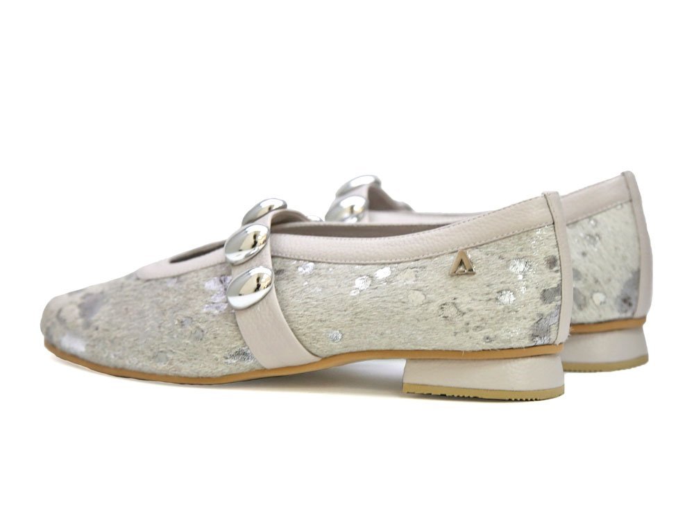 Baleta elaboradas en cuero natural con acabado metalizado. Su diseño combina elegancia y comodidad, ideal para uso diario o eventos casuales. La tira con botones decorativos metálicos aporta un aire sofisticado y original.
