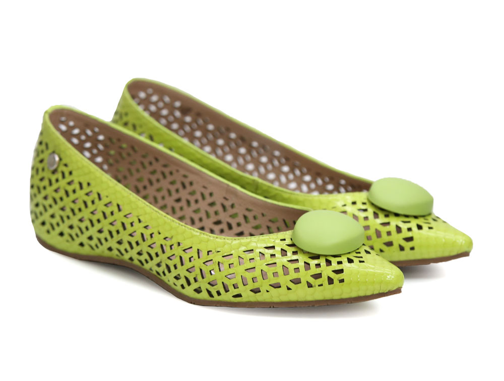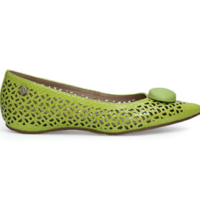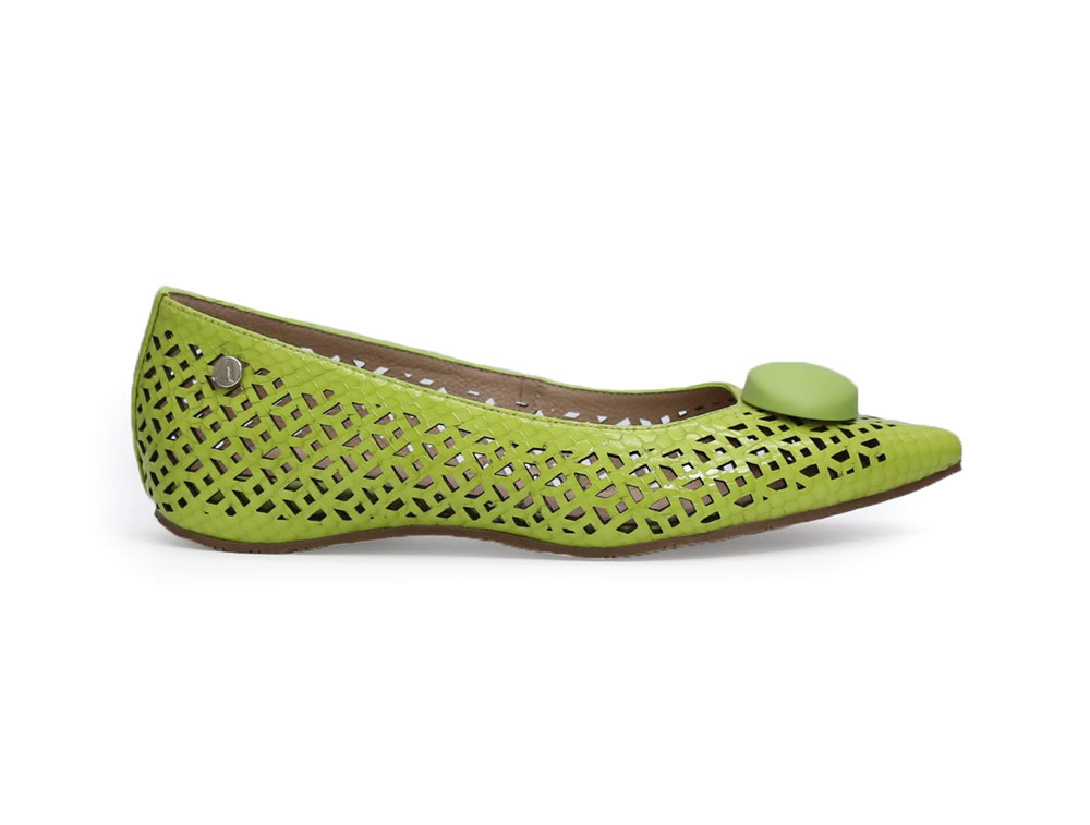 Baleta verde lima, con troquelado geométrico que permite ventilación y un toque distintivo. Posee punta fina y un adornado decorativo del mismo color. Estas baletas con tacón interno son una excelente opción para quienes buscan la comodidad. Elaborados por manos Colombianas. |