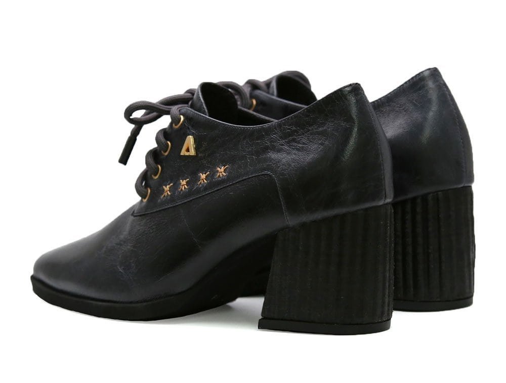 Bolichero elaborado en cuero. Su tacón ancho tiene un estilo elegante pero con un aire moderno.