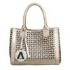Bolso en cuero con un diseño sofisticado que combina diferentes texturas y colores para un look moderno y elegante. Su estructura amplia lo convierte en el complemento ideal para el uso diario, ofreciendo funcionalidad sin perder estilo. Incluye un delicado accesorio decorativo que aportan un toque  distintivo.