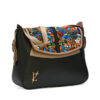 Bolso en cuero, manos libres de LIMON PIEL, con diseños florales en fondo negro.