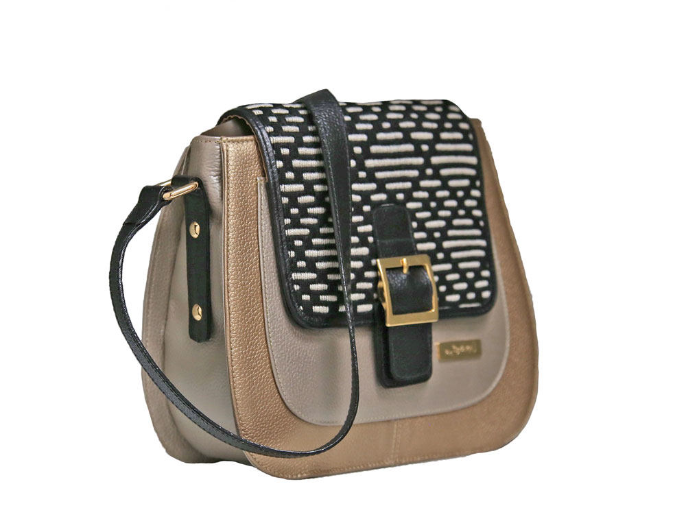 Bolso en cuero, manos libres de LIMON PIEL. La solapa superior destaca por su diseño étnico en blanco y negro, elaborado en tejido decorativo que aporta un contraste visual atractivo.