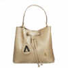 Bolso en cuero dorado. Su diseño incluye cierre ajustable con cordón, ojales metálicos en tono dorado y un asa superior amplia para mayor comodidad.