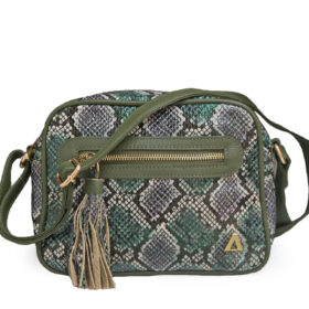 Bolso en cuero que aporta un estilo sofisticado y elegante. Su diseño en color verde con un detalle en animal print, lo que le da un contraste moderno y versátil.