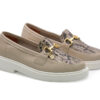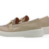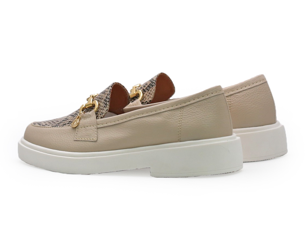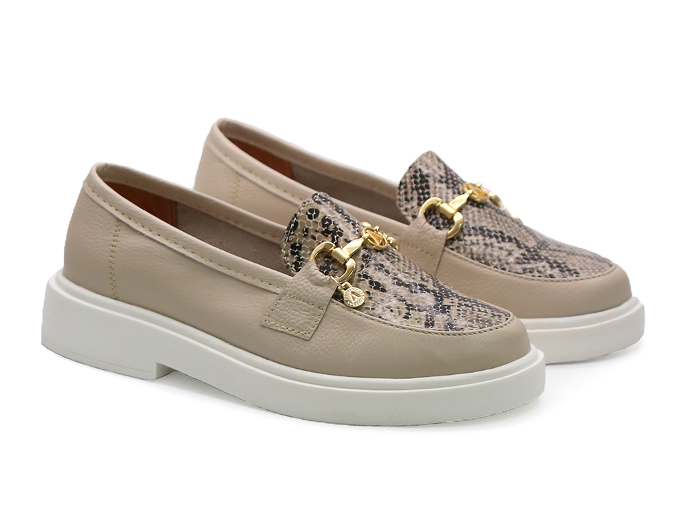 Mocasín en cuero beige, con un herraje en su parte frontal. Están diseñados para quienes buscan una combinación perfecta de estilo, confort y resistencia. suela liviana y flexible. Elaborados por manos Colombianas. |