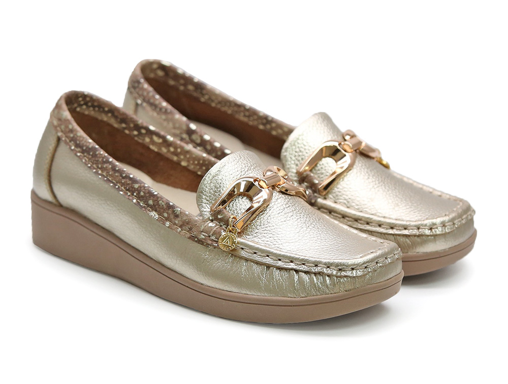 Mocasin en cuero tacon playa con acabado metalizado oro. Ideales para quienes buscan comodidad sin renunciar al estilo. Su diseño clásico, aporta un toque sofisticado y moderno. |