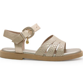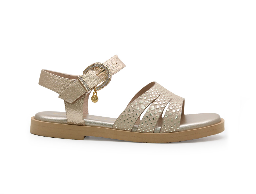 Sandalia plana en cuero con acabado en folia oro. La hebilla con detalles brillantes añade un toque de glamour, mientras que la suela plana brinda confort y estabilidad en cada paso Hechas por manos colombianas |
