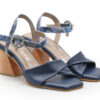 Sandalia azul con tacon en madera. Cuenta tira ancha me mayor agarre, y un diseño unico de folia en su correa. Plantilla suave y suela antideslizante.