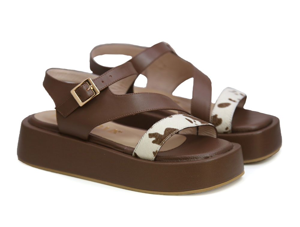 Sandalia de plataforma que brinda altura y estabilidad .Detalles en “animal print” en la tira frontal, aportando un toque distintivo y elegante.  Añade una correa trasera ajustable con hebilla metálica dorada que asegura un calce perfecto y elegante. Un modelo versátil que combina moda y comodidad, ideal para elevar cualquier look casual o sofisticado.