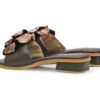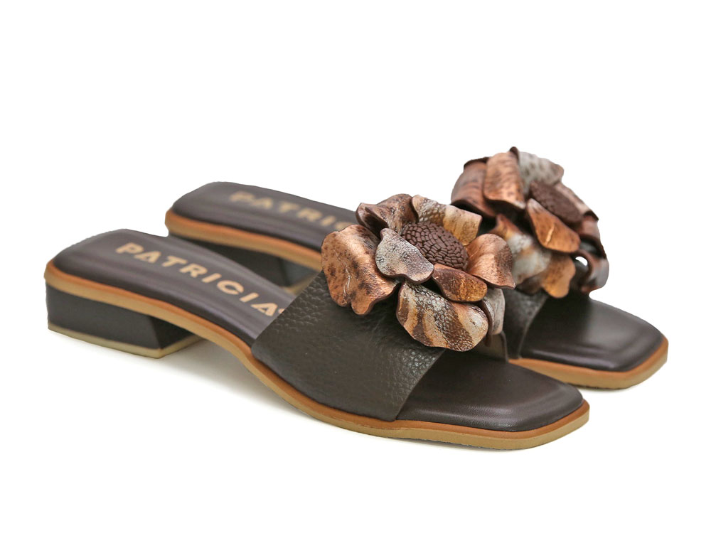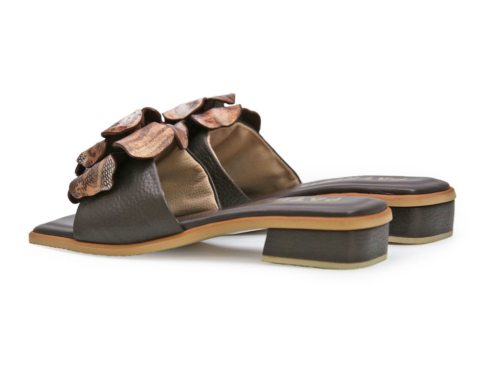 Sandalia plana en cuero. La parte superior luce una gran flor con acabado en folia. Un calzado sofisticado y original, ideal para realzar conjuntos casuales o dar un toque atrevido a looks más refinados. Hechas por manos colombianas |
