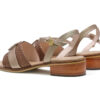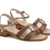 Sandalia en cuero color miel. Tienen un diseño de punta cuadrada, con una correa frontal ancha, textura en folia y hebilla decorativa. |