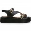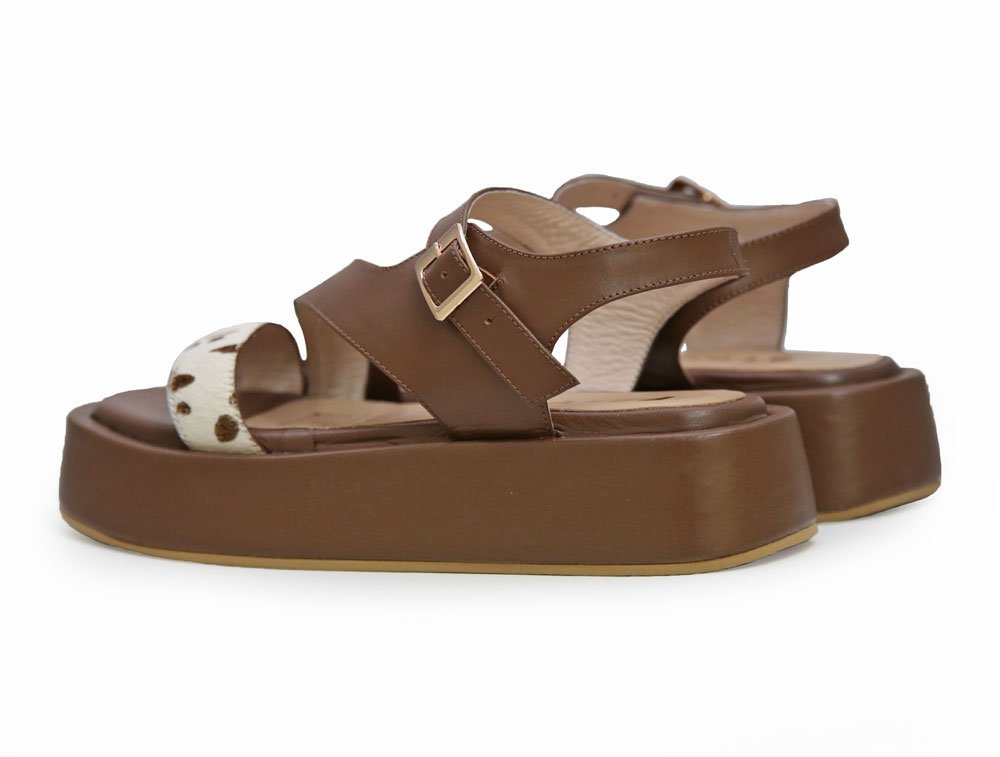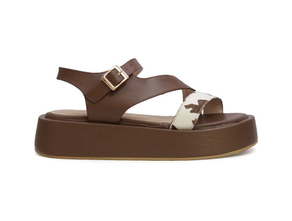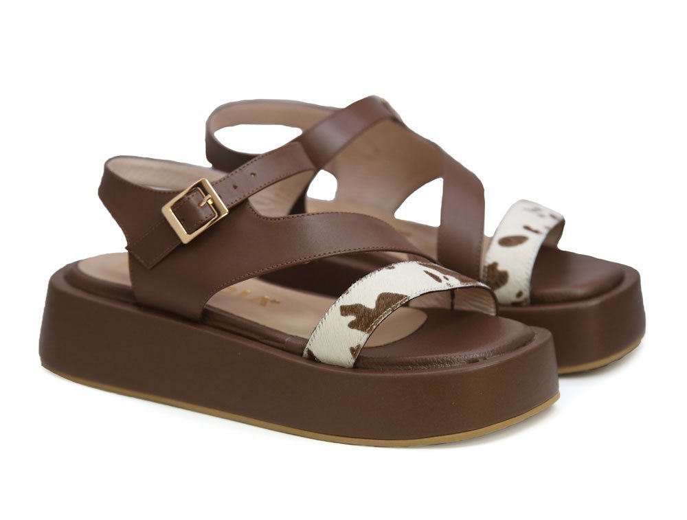 Sandalia de plataforma que brinda altura y estabilidad .Detalles en “animal print” en la tira frontal, aportando un toque distintivo y elegante. Añade una correa trasera ajustable con hebilla metálica dorada que asegura un calce perfecto y elegante. Un modelo versátil que combina moda y comodidad, ideal para elevar cualquier look casual o sofisticado. |