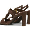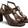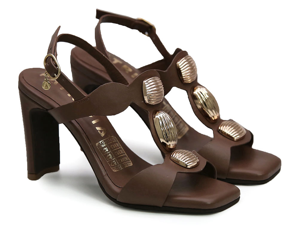 Sandalia de tacón alto, con capellada en forma de T que realza el empeine y estiliza la figura. Está elaborada en cuero café y decorada con herrajes metálicos llamativos en tendencia, que aportan un toque moderno y sofisticado. Su diseño incluye tira ajustable con hebilla lateral para un ajuste perfecto. Plantilla acolchada que brinda comodidad durante todo el día. Hechas por manos colombianas |