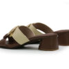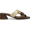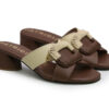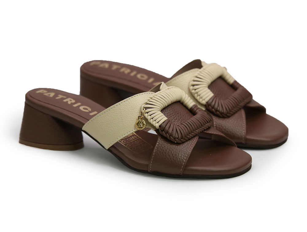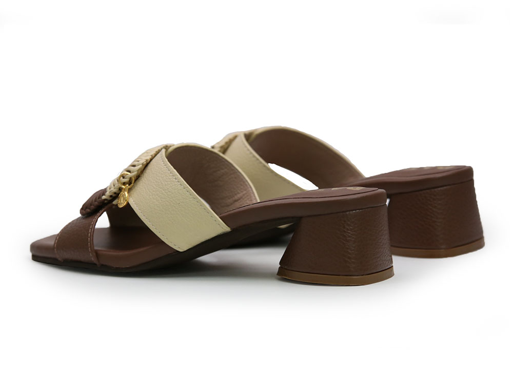 Sandalia elaborada en cuero, combinando tonos cafe y mantequilla que aportan elegancia y versatilidad. Su diseño destaca por una capellada con detalle tejido en forma de hebilla decorativa, que le da un estilo moderno y artesanal. Tacón cuadrado de altura 3.5 que garantiza comodidad y estabilidad.