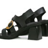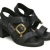 Sandalias elaboradas en cuero negro. Su diseño presenta tiras cruzadas con una hebilla metálica dorada que añade un toque de distinción y permite un ajuste firme al pie. La plantilla, también forrada en cuero, está acolchada para ofrecer máxima comodidad durante todo el día.