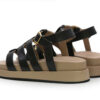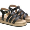 Sandalia en cuero negro tipo gladiador. Cuentan con múltiples tiras en la parte delantera que se unen en el centro, brindando buen soporte al pie. La plataforma color beige aporta un contraste moderno y un extra de altura que estiliza la silueta. Hechas por manos colombianas. |