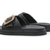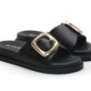 Sandalia plana negra en cuero. Cuenta con una tira ancha en la parte frontal decorada con una llamativa hebilla metálica de gran tamaño, que no solo realza su estilo, sino que también añade un aire distintivo y elegante. La suela es acolchada y ergonómica, brindando comodidad para uso prolongado. Hechas por manos colombianas |