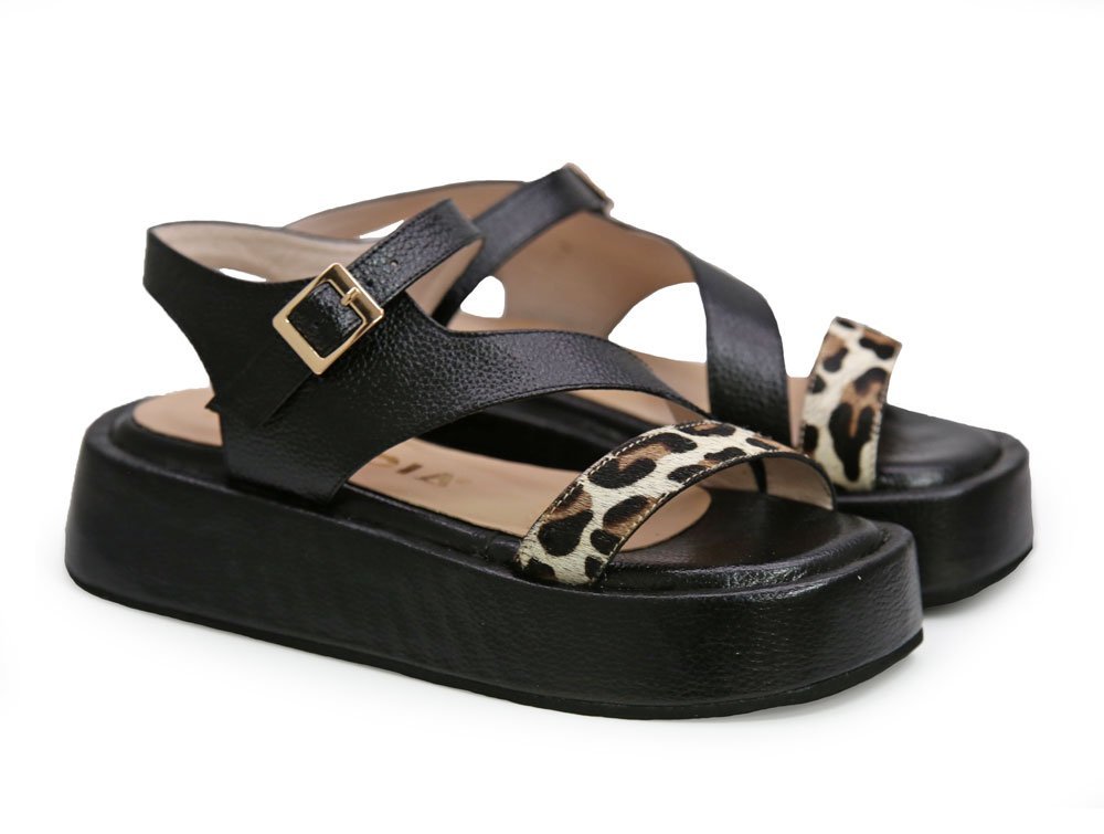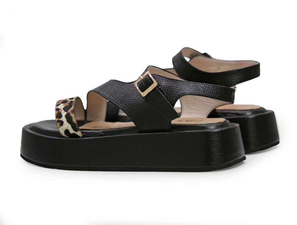 Sandalia de plataforma que brinda altura y estabilidad .Detalles en “animal print” en la tira frontal, aportando un toque distintivo y elegante. Añade una correa trasera ajustable con hebilla metálica dorada que asegura un calce perfecto y elegante. Un modelo versátil que combina moda y comodidad, ideal para elevar cualquier look casual o sofisticado. |