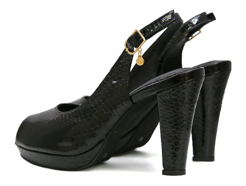Sandalia en cuero negro con diseño en folia charol. Su estilo le da un toque moderno y refinado. Tacón forrado ancho, lo que garantiza estabilidad sin perder la elegancia. Son perfectas para complementar cualquier atuendo formal o de fiesta. Hechas por manos colombianas |
