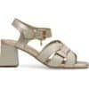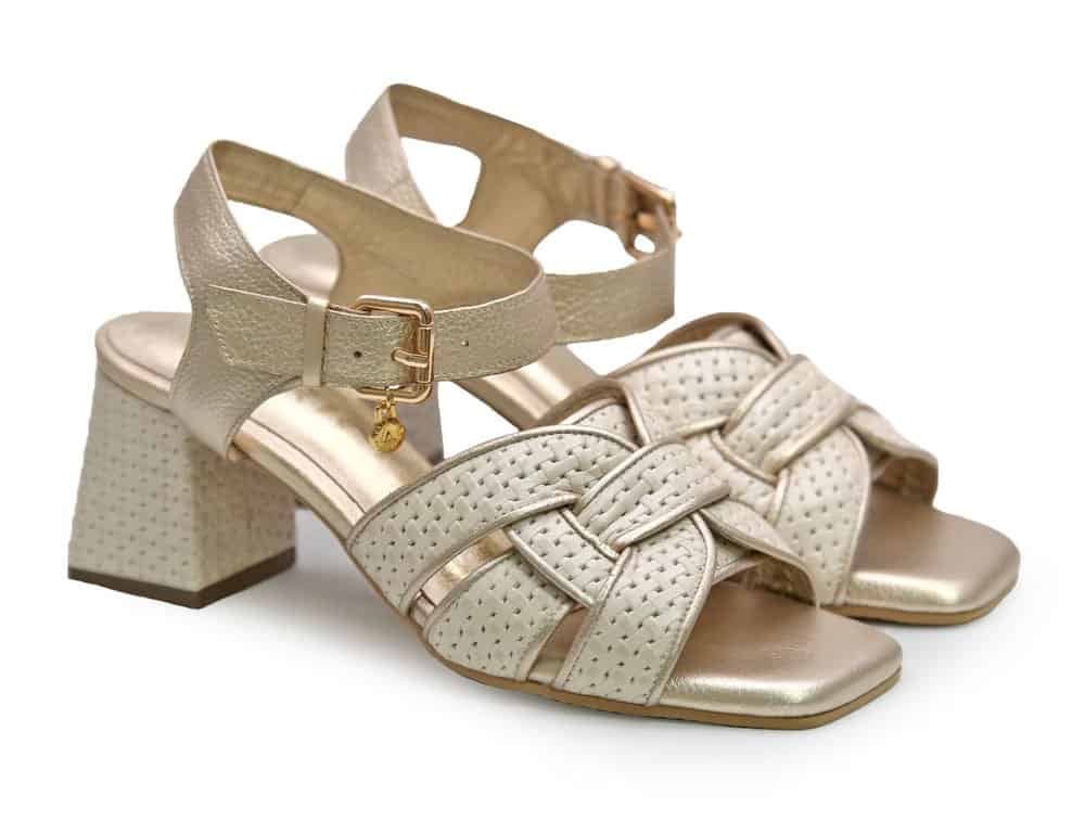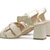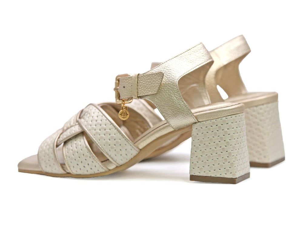 Sandalia de tacon elaborada en cuero. Posee un acabado en tono beige claro y dorado, ideal para combinar con distintos estilos, desde looks casuales hasta más formales. El diseño incluye tiras cruzadas en la parte delantera que aportan un toque sofisticado. Añade correa , para mejor ajuste. Hecho por manos colombianas. |