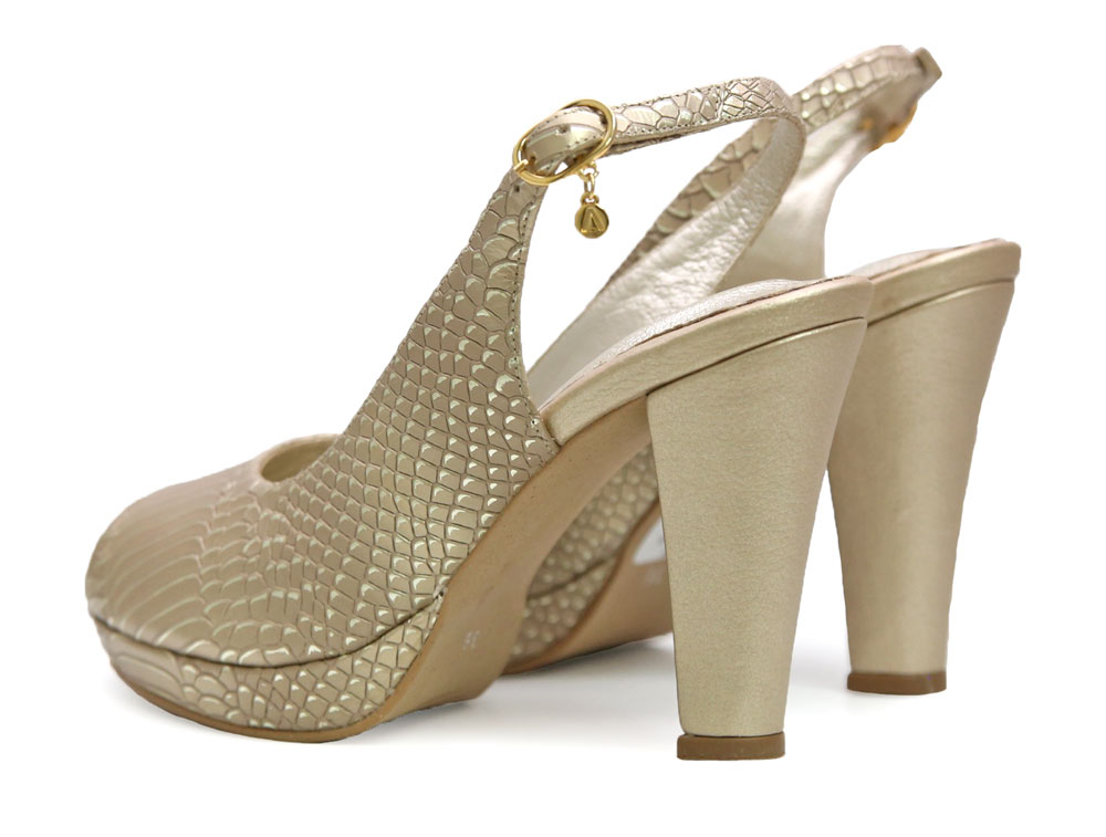 Sandalia en cuero dorada con plataforma y acabado en folia. Su diseño le da un toque moderno y refinado. Tacón forrado ancho, lo que garantiza estabilidad sin perder la elegancia. Son perfectas para complementar cualquier atuendo formal o de fiesta. Hechas por manos colombianas |