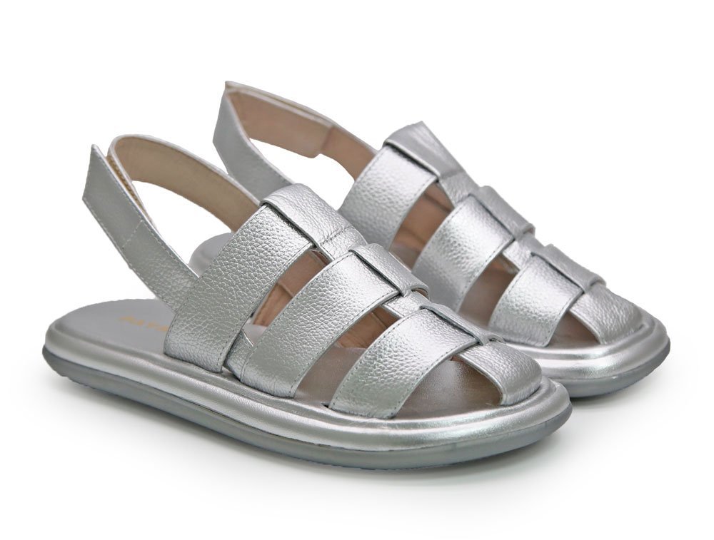 Sandalia plana en cuero plata con tiras anchas cruzadas (tipo canasta), que brindan mayor ajuste. Cuenta con plantilla acolchada ,suela de goma antideslizante y correa en velcro. Ideales para el uso diario o para complementar un look casual con estilo. Hechas por manos colombianas |