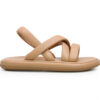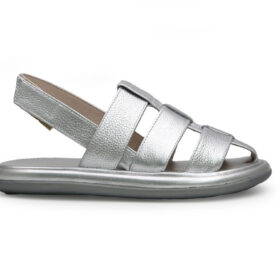 Sandalia plana en cuero plata con tiras anchas cruzadas (tipo canasta), que brindan mayor ajuste.