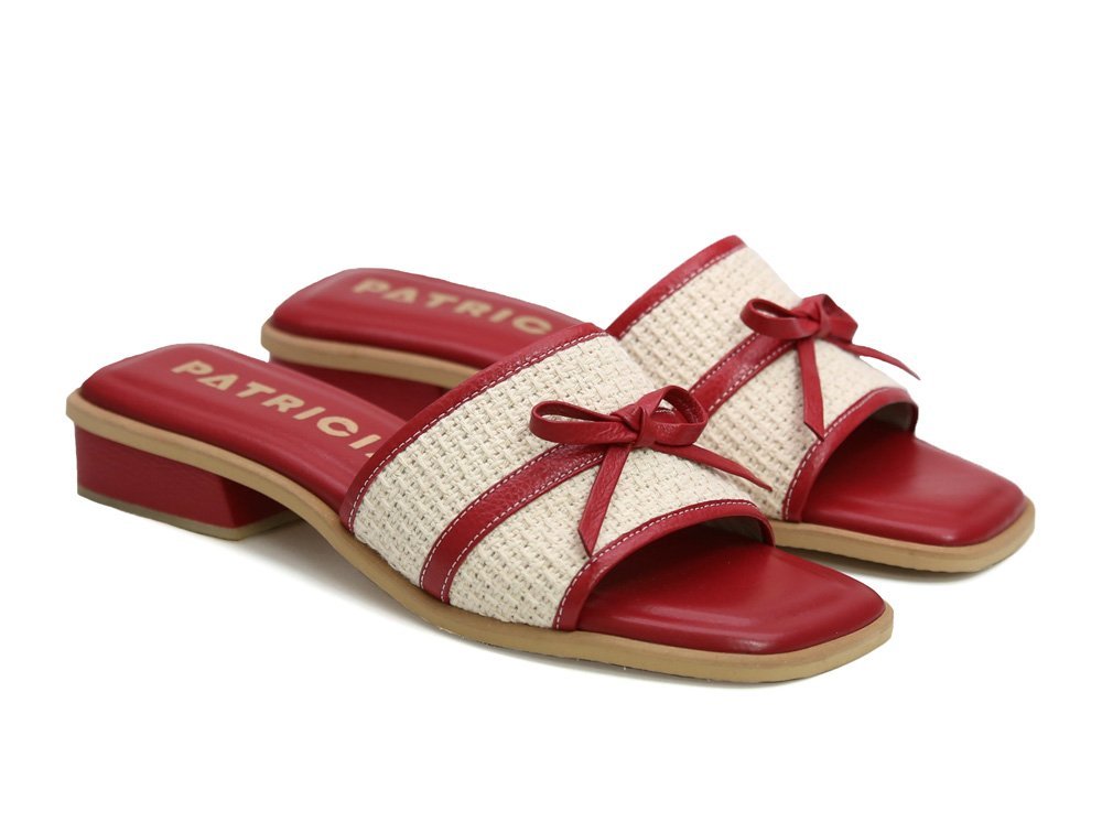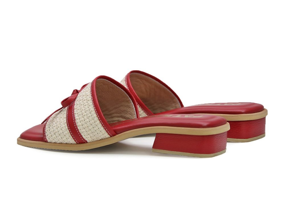 Sandalia en cuero rojo. Están elaboradas con una capellada ancha y un diseño en tejido trenzado beige. Posee un lazo en color rojo que aporta un toque femenino y sofisticado. La plantilla acolchada en tono rojo, garantiza confort durante todo el día.