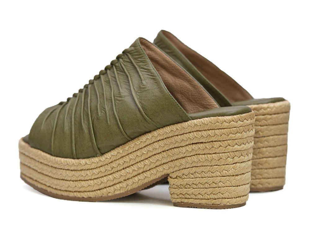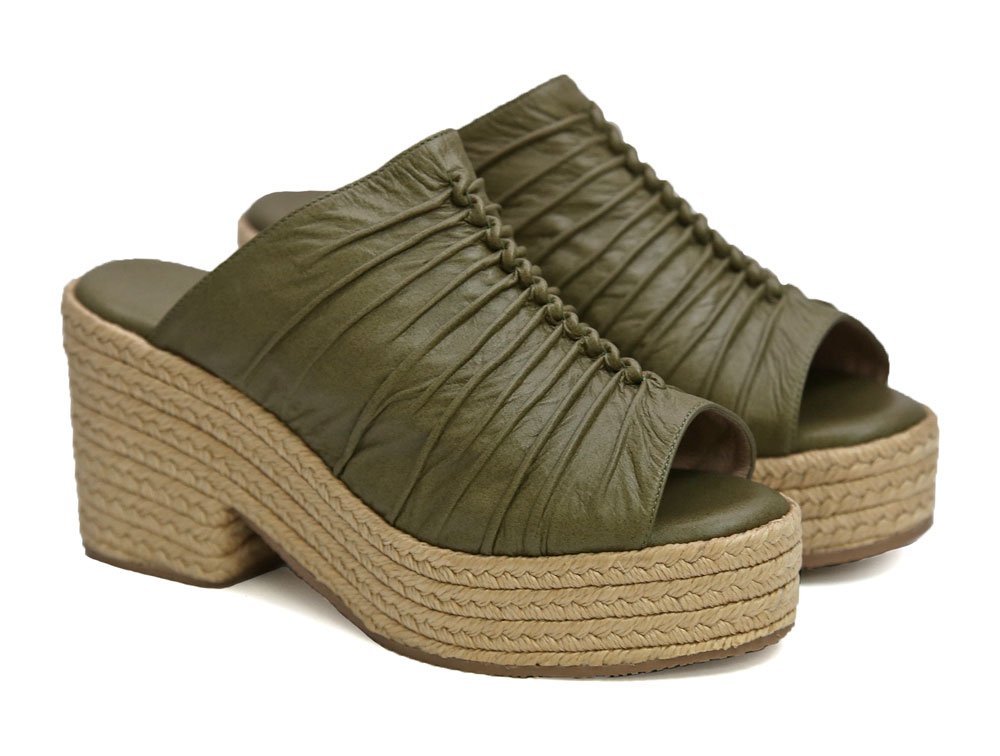 Sandalias de plataforma están elaboradas en cuero color verde oliva, con un diseño moderno y sofisticado. La capellada presenta un efecto arrugado que aporta textura y estilo. La suela está elaborada en yute trenzado, aportando un toque natural, ideal para looks frescos y casuales. Hechas por manos colombianas. |
