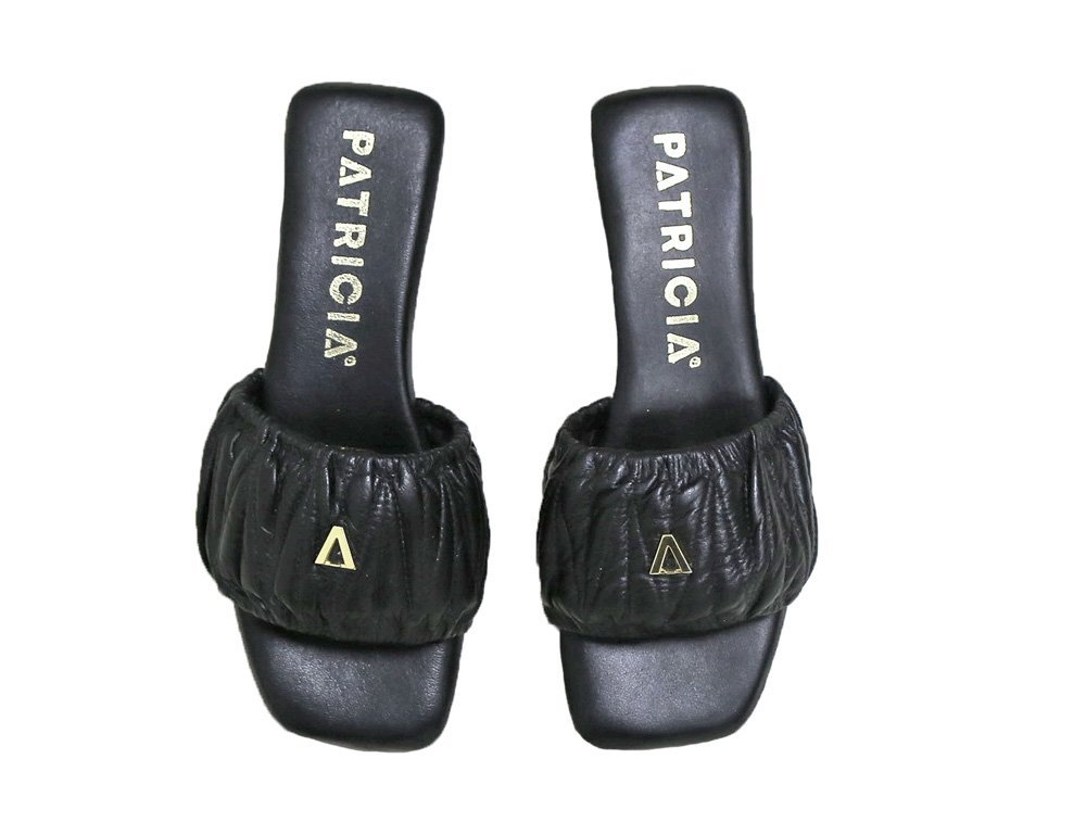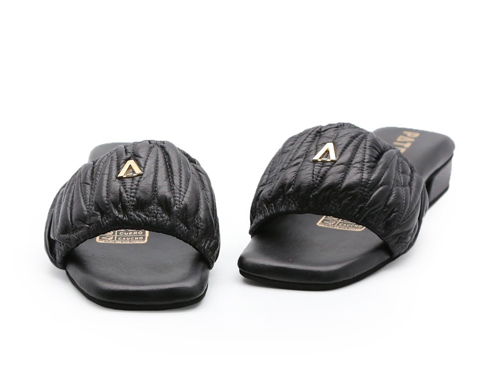 Sandalia plana negra, en cuero con textura acolchada, y capellada ancha para mayor comodidad. Esta sandalia ofrece un estilo muy internacional fresco y cómodo, perfectas para tus días más casuales o de playa. Hechas 100% por manos colombianas. |