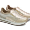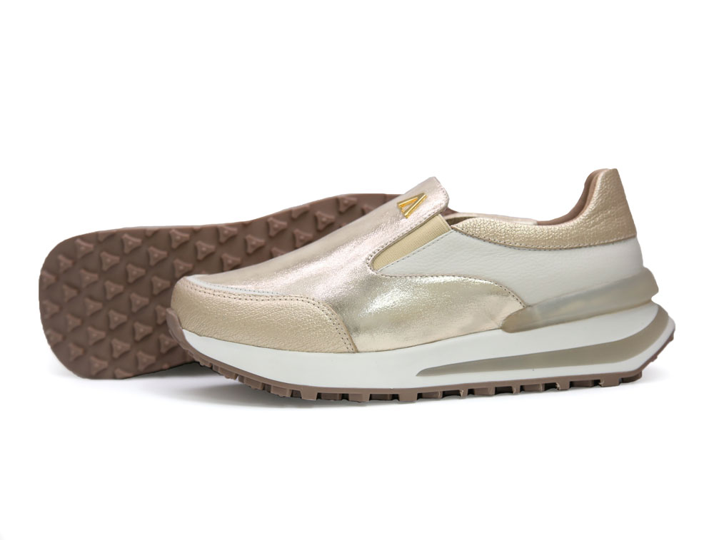 Tenis en cuero con acabado metalizado, deal para un estilo casual y moderno. Posee elásticos laterales que dan un ajuste cómodo, sin necesidad de cordones.