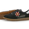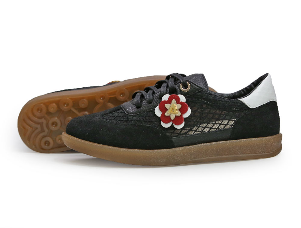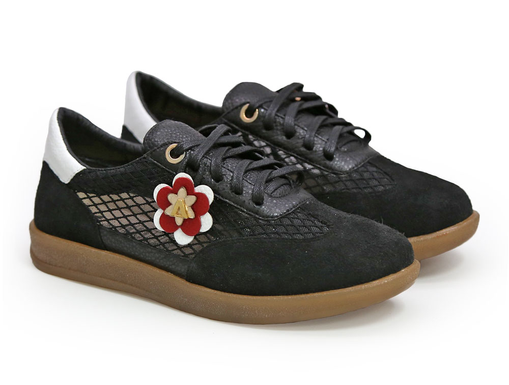 Tenis que combina cuero, carnaza y malla textil, logrando un diseño moderno y ligero. Destaca un adorno en forma de flor que añade un toque decorativo y distintivo.