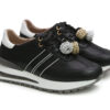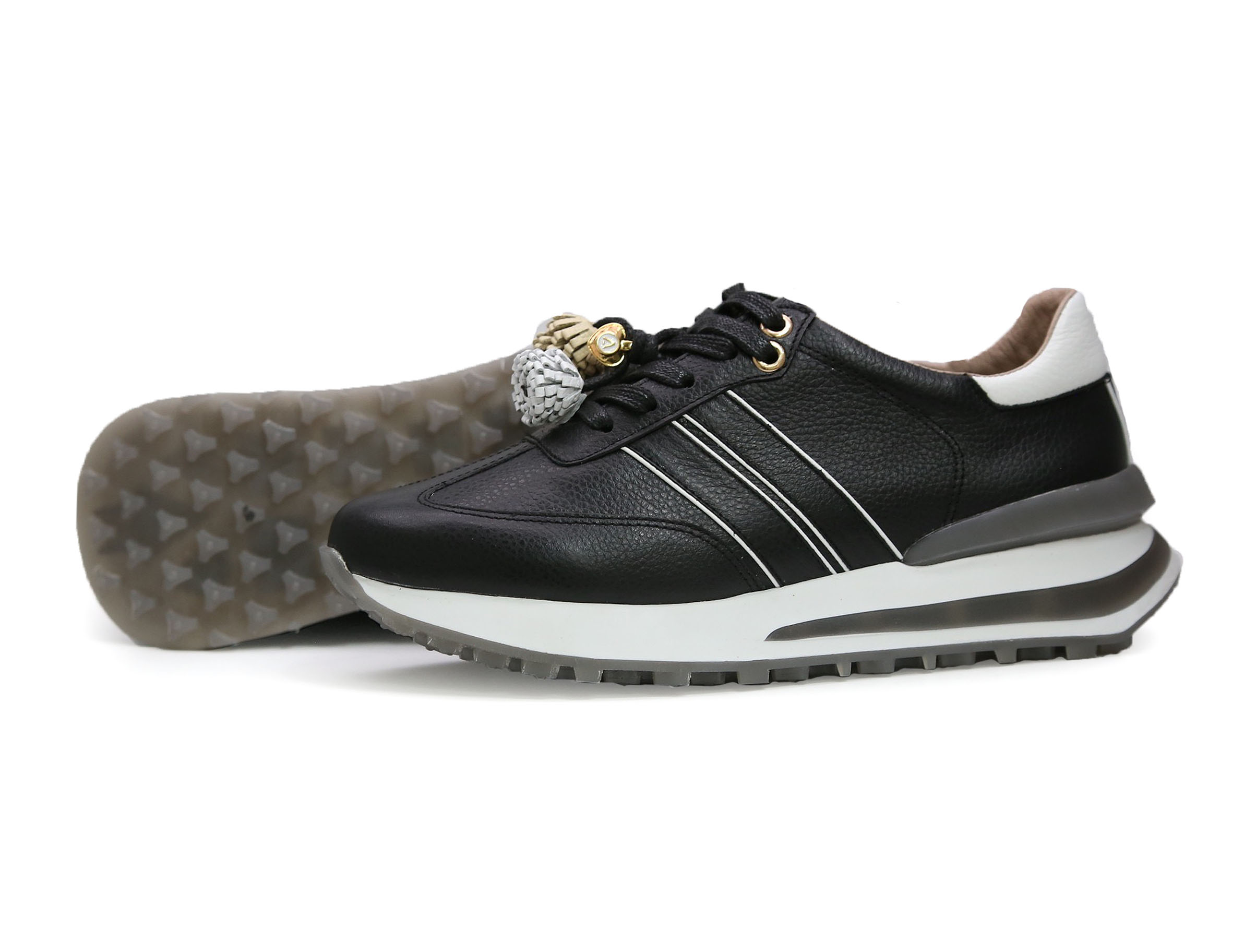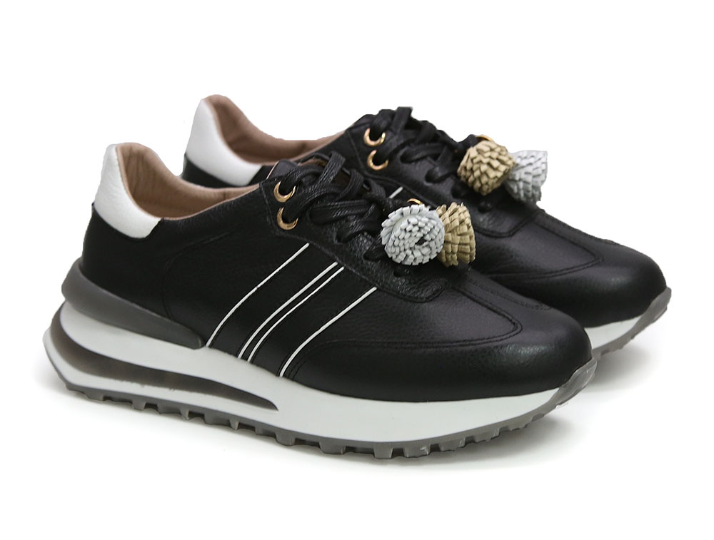 Tenis moderno y elegante, con accesorios decorativos que añaden un toque distintivo. Su silueta deportiva acompañada de una suela elevada, ofrece una apariencia elegante sin perder practicidad. Sus líneas blancas laterales  realzan su estilo.  Su interior acolchado ofrece comodidad durante todo el día.