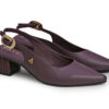 Zapatilla destalonada en cuero con punta fina que estiliza el pie, Posee correa ajustable y hebilla metálica garantizando un ajuste cómodo y seguro.