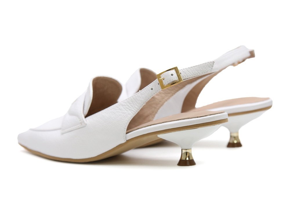 Zapatilla en cuero blanco, diseñadas para ofrecer elegancia y confort en cada paso. Plantilla acolchada, correa ajustable junto con un accesorio moderno y distintivo. Hecho por manos colombianas. |