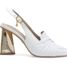 Zapatilla destalonada. Cuenta con cuero grabado con acabado en folia oro, y un Tacón tipo espejo de 7.5cm de alto. Elegantes y delicados, para hacerte lucir outfits sofisticados. Hechos por manos colombianas. |