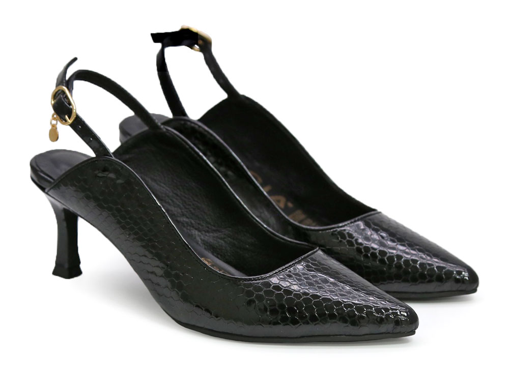 Zapatilla destalonada en cuero charol. Cuenta con punta fina, correa ajustable y tacón medio que aporta elegancia y comodidad. Su diseño estilizado la hace perfecta para ocasiones formales, eventos o para elevar looks diarios con un toque sofisticado.