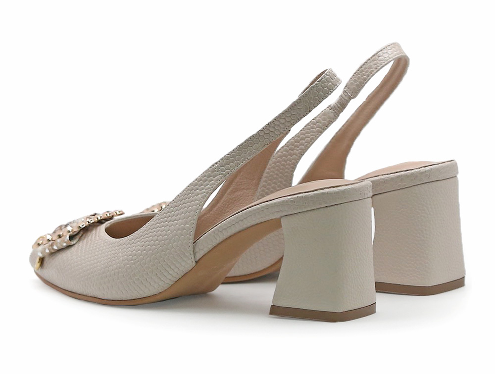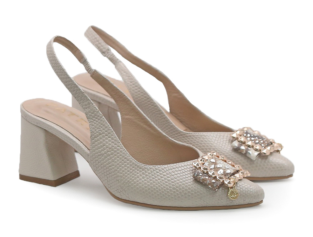 Zapatilla destalonada en cuero grabado. Cuenta con un accesorio en su parte frontal y correa elastica. Perfectos para usar con tus outfits formales o de fiesta. Un estilo clasico para sentirte unica y elegante. Hecho por manos colombianas. |