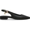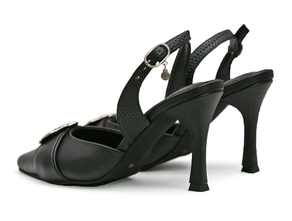Zapatilla en cuero color negro, diseñado con punta fina y un tacón delgado que estiliza la figura. Su acabado con correa ajustable asegura un calce cómodo, mientras que el accesorio plateado en la parte frontal aporta un toque sofisticado y en tendencia. Este diseño combina estilo y confort gracias a su plantilla acolchada y suela antideslizante, siendo la opción ideal para realzar cualquier look formal o de ocasión especial. Hecho por manos colombianas. |