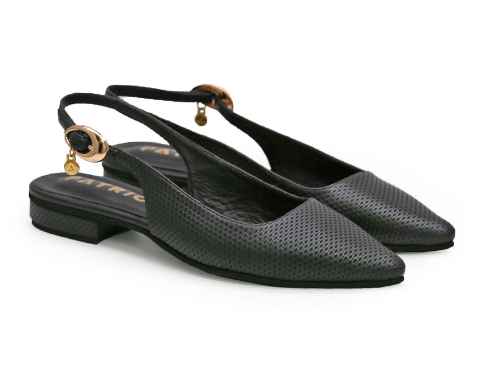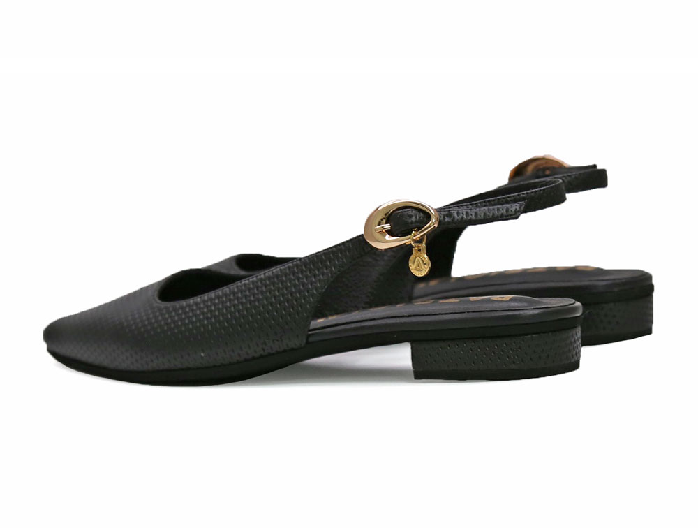 Baleta destalonada en cuero color negro. Su diseño de punta cerrada estiliza el pie, convirtiendola en una opcion de uso diario , oficina o eventos combinando a la perfección comodidad y estilo. Posee correa ajustable, y plantilla acolchada para mayor confort. Elaborados por manos Colombianas. |