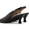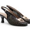 Zapatilla de tacón destalonada con textura perforada a laser en folia. Cuenta con correa elastica y un accesorio cromado en forma de corazon en su parte frontal. Elegantes y delicados, para hacerte lucir estilizada con tus outfits mas casuales y elegantes, realzando tu comodidad.